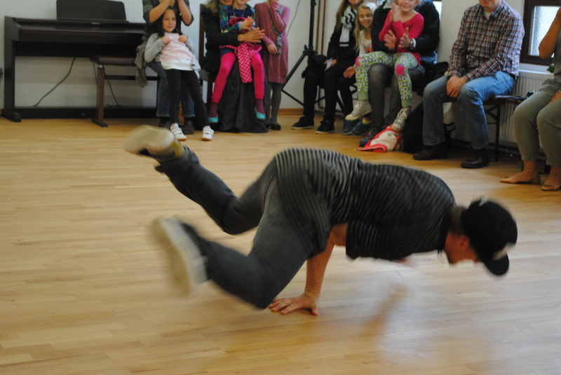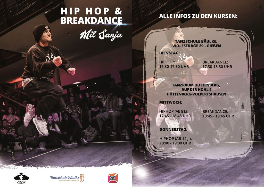 Im Unterricht geht es vor allem um den tänzerischen Aspekt von „Breakdance“ (eigentlich „Breaking“ oder „B-Boying/B-Girling“ genannt). Breakdance ist viel mehr als Salto und auf dem Kopf drehen. Im Breaking-Kurs lernt man, sich zur Funk-Musik zu bewegen. Man erlernt nicht nur Tanz-Moves, sondern auch Rythmusgefühl, Musikalität und seinen eigenen Style kennen. Neben TopRocks (Moves, die man im Stand ausübt) lernt man verschiedenste Arten von GoDowns (Bewegungen, um aus dem Stand auf den Boden zu gelangen). Über die GoDowns arbeitet man am Boden mit sogenannten Footworks (Moves auf dem Boden, bei denen man auf Händen und Füßen Schnelligkeit, Präzision und Musikalität beweist). Um ein Set abzuschließen nutzt man sogenannte Freezes (abrupt gesetzte Posen, die den Bewegungsfluss stoppen(einfrieren); dazu zählen Handstände, Kopfstände, einfache Posen im Stand und vieles mehr). Zusätzlich gibt es noch Spielereien auf dem Boden wie die FloorRocks (Bewegungen in Rücken-/Bauchlage) und Powermoves (Akrobatische Drehungen um die eigene Körperachse wie z.B. der Headspin (Drehung auf dem Kopf). Der Breaking ist ein sehr abwechslungsreicher Tanz, welcher Körper und Geist gleichermaßen stärkt. Kraft-und Beweglichkeits-Training sind Grundlagen des Kurses, um eine Prävention vor Verletzungen zu schaffen. Aufgrund der Tatsache, dass dieser Tanz aus der HipHop-Kultur entstanden ist, werden während des Unterrichts zusätzlich geschichtliche Aspekte vermittelt, denn neben der Praxis selbst ist es ebenso wichtig sich mit der Theorie zu beschäftigen. Kommt einfach vorbei! Wir sehen uns!